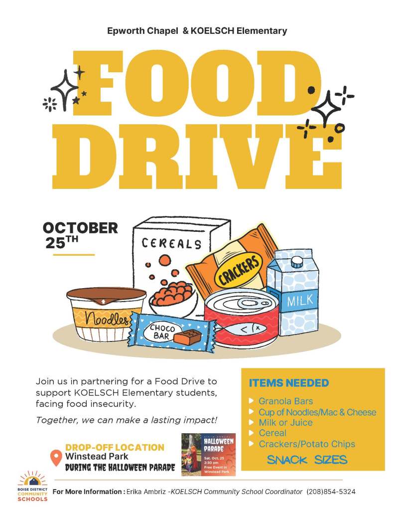 Join Epworth Chapel in a food drive to support Koeslch Elementary students facing food insecurity. Items needed include snack sizes of: crackers, potato chips, and granola bars, cup noodles, mac and cheese, cereal, small boxes of milk and juice. Bring items to the Halloween Parade. For more information: Erika Ambriz, Koelsch Community School Coordinator, (208) 854-5324.
